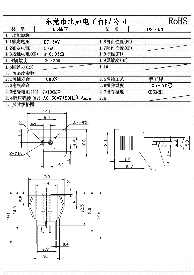 Typical Specifications 1. Rating : DC 30V 0.5A 2. Contact Resistance : 70?Max 3.Lnsulation Resistance: DC500V 1Minute 4.Operating Temperature Range: -25℃+80℃ 5.Ambient Humidity Used: ≤85%RH 6. Operating Force : 3-20N 7. Operating Life : 5,000Cycles