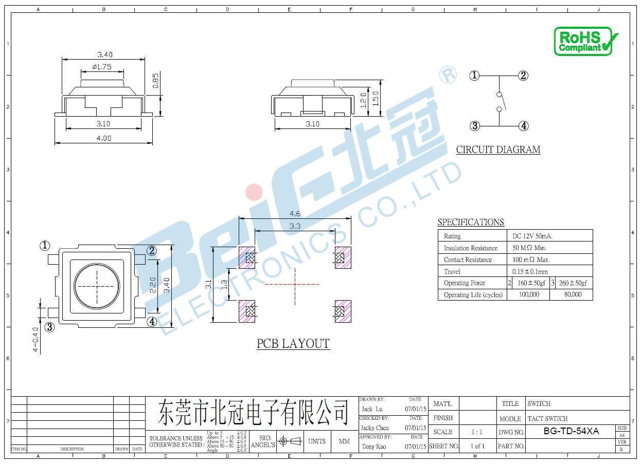 輕觸開關(guān)TD-54XA是輕觸按鍵開關(guān),屬于微小型輕觸開關(guān)。長(zhǎng)寬為3mm*3mm,高度1.5mm,因其體積小的特點(diǎn)主要用戶數(shù)碼產(chǎn)品、玩具、血壓計(jì)、安防等行業(yè)。