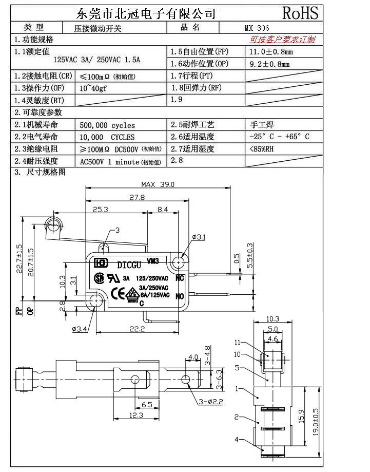Typical Specifications 1.Rating : DC30V 0.1A 2.Contact Resistance: ≤100mΩ 3.Lnsulation Resistance: ≥100mΩ DC500V 4.Operating Temperature Range: -25℃+85℃ 5.Ambient Humidity Used: ≤85%RH 6.Mechanical Life: 100,000Cycles 7.Operating Force:30±10gf 8.OP:8.8±0.8mm 9.Order: AC 125V 3A