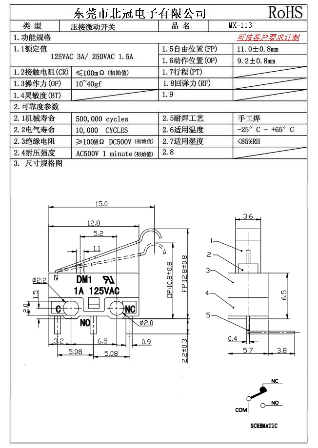 Typical Specifications 1.Rating : DC30V 0.1A 2.Contact Resistance: ≤100mΩ 3.Lnsulation Resistance: ≥100mΩ DC500V 4.Operating Temperature Range: -25℃+85℃ 5.Ambient Humidity Used: ≤85%RH 6.Mechanical Life: 100,000Cycles 7.Operating Force:30±10gf 8.OP:8.8±0.8mm 9.Order: AC 125V 3A