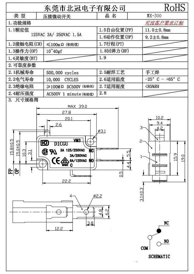 3.Lnsulation Resistance: ≥100mΩ DC500V