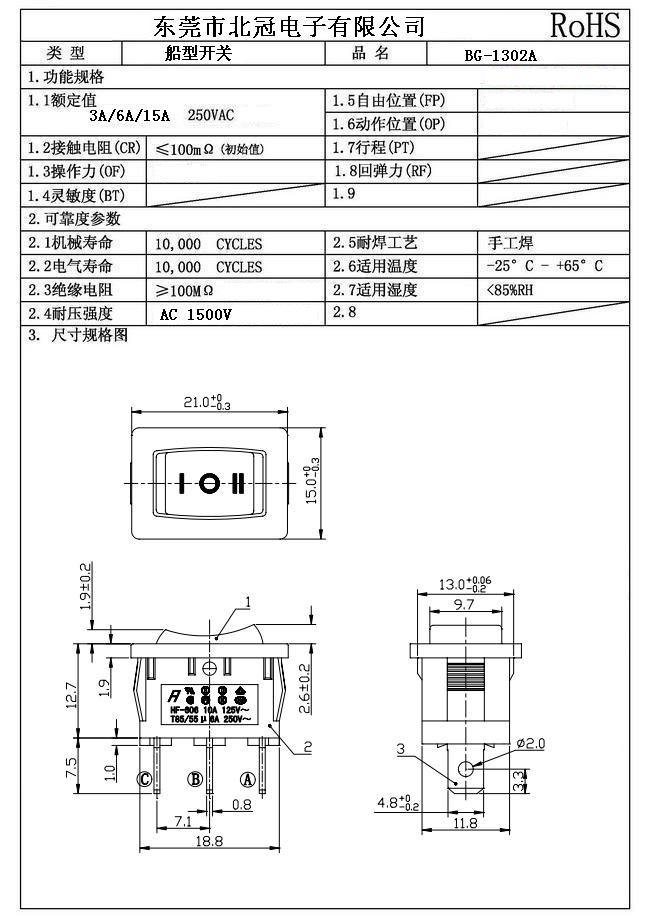 技術(shù)參數(shù)〔SPECIFICATION〕 額定電流、電壓: 6(4)A 250VAC 6A/125A 250VAC 6A 250VAC/10A 125VAC 接觸電阻:≤20mΩ 絕緣電阻:≥100MΩ 介電強度:≥1800VAC/3S 電器壽命:≥10000次