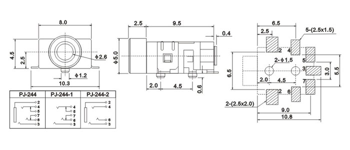 品名:2.5耳機插座 耳機插座技術參數(shù): 1.額定負荷:0.5A 30V DC 2.按觸電阻:100 mΩ max. 3.使用溫度:-20℃~70℃ 4.插拔力:3-20N 5.使用壽命:5,000cycles 耳機插座主要組成部件: 1.塑膠底座 2.磷銅或鈹銅簧片